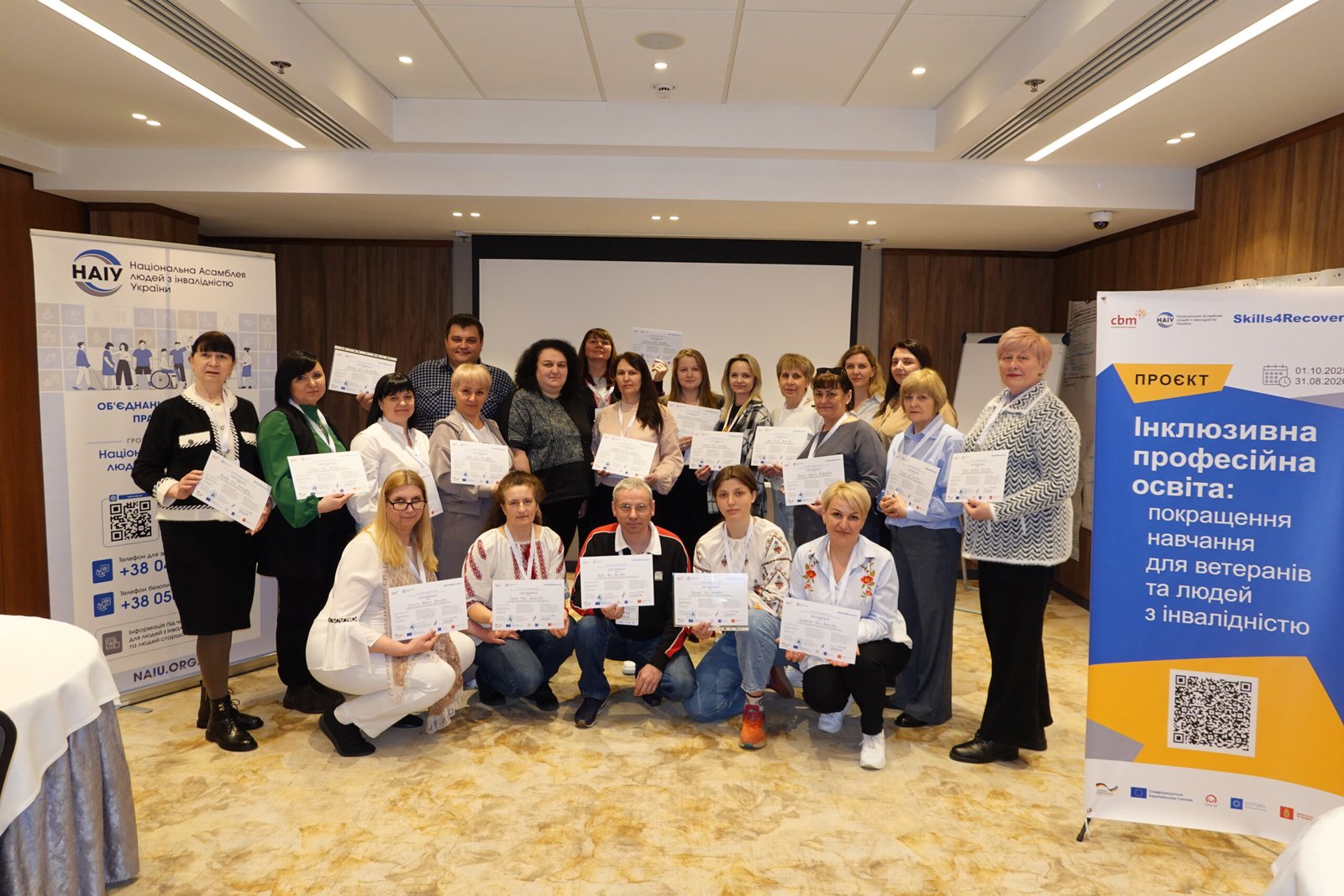 Проєкт «Інклюзивна професійна освіта: покращення навчання для ветеранів та людей з інвалідністю» впроваджується Національною Асамблеєю людей з інвалідністю України (НАІУ) спільно з Christoffel-Blindenmission Christian Blind Mission e.V. (CBM) за фінансової підтримки Європейського Союзу, Німеччини, Польщі, Естонії та Данії в межах Мультидонорської ініціативи Skills4Recovery, яка реалізується Deutsche Gesellschaft für Internationale Zusammenarbeit (GIZ) GmbH та Solidarity Fund PL (SFPL).