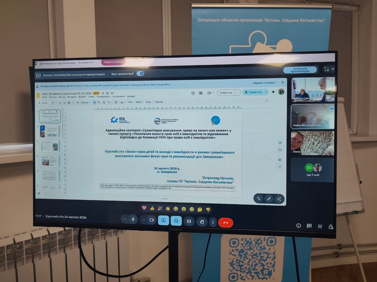 Громадська організація «Аутизм. Свідоме батьківство» провела круглий стіл «Захист прав дітей та молоді з інвалідністю в умовах гуманітарного реагування: висновки фокус-груп та рекомендації для Запоріжжя». Захід відбувся у межах адвокаційної кампанії «Гуманітарне реагування: право на захист має кожен», що здійснюється під час реалізації проєкту «Посилення захисту прав осіб з інвалідністю під час гуманітарного реагування та відновлення відповідно до Конвенції ООН про права осіб з інвалідністю».
