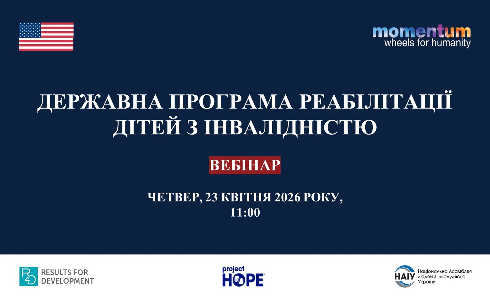 Ця ініціатива стала можливою завдяки щедрій підтримці американського народу за підтримки Агентства США з міжнародного розвитку згідно з угодою про співпрацю з Partnerships Plus під номером 7200AA18CA00032, яка фінансується з 28 вересня 2018 року, та реалізується Інститутом досліджень і навчання JSI у відповідності до угоди під номером PP-EI-001 з Momentum Wheels for Humanity. Зміст є відповідальністю Національної Асамблеї людей з інвалідністю України і не обов’язково відображає погляди USAID або уряду Сполучених Штатів.