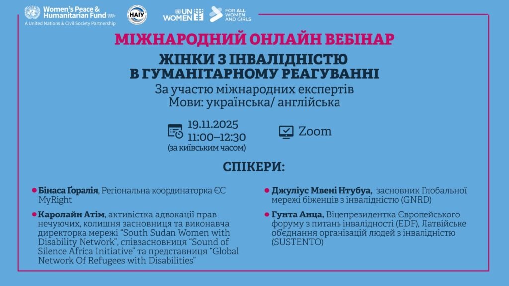 У межах проєкту «Гуманітарне реагування та відновлення: посилення лідерства організацій жінок з інвалідністю», який реалізується за технічної підтримки ООН Жінки в Україні та фінансування Жіночого фонду миру та гуманітарної допомоги ООН (WPHF), запрошуємо вас долучитися до Міжнародного онлайн вебінару «Жінки з інвалідністю в гуманітарному реагуванні»