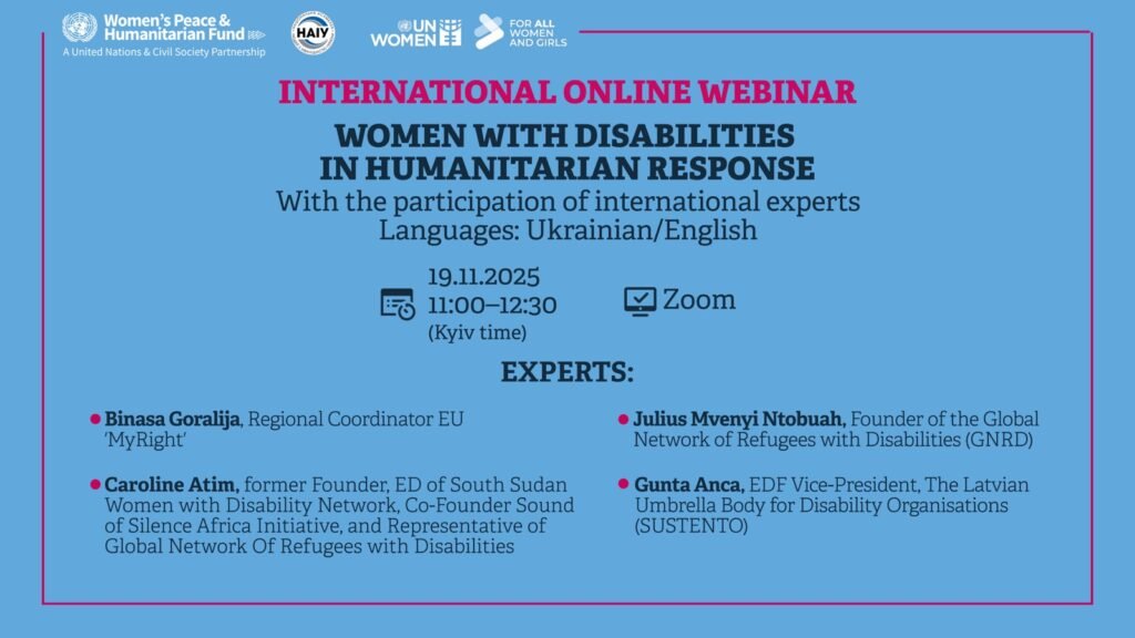 Посилання для реєстрації: https://us06web.zoom.us/meeting/register/TZSJxttjQJWaLagY4UtA0Q#/registration Мови проведення заходу: українська, англійська, жестова мова У межах проєкту «Гуманітарне реагування та відновлення: посилення лідерства організацій жінок з інвалідністю», який реалізується за технічної підтримки ООН Жінки в Україні та фінансування Жіночого фонду миру та гуманітарної допомоги ООН (WPHF), запрошуємо вас долучитися до Міжнародного онлайн вебінару «Жінки з інвалідністю в гуманітарному […]