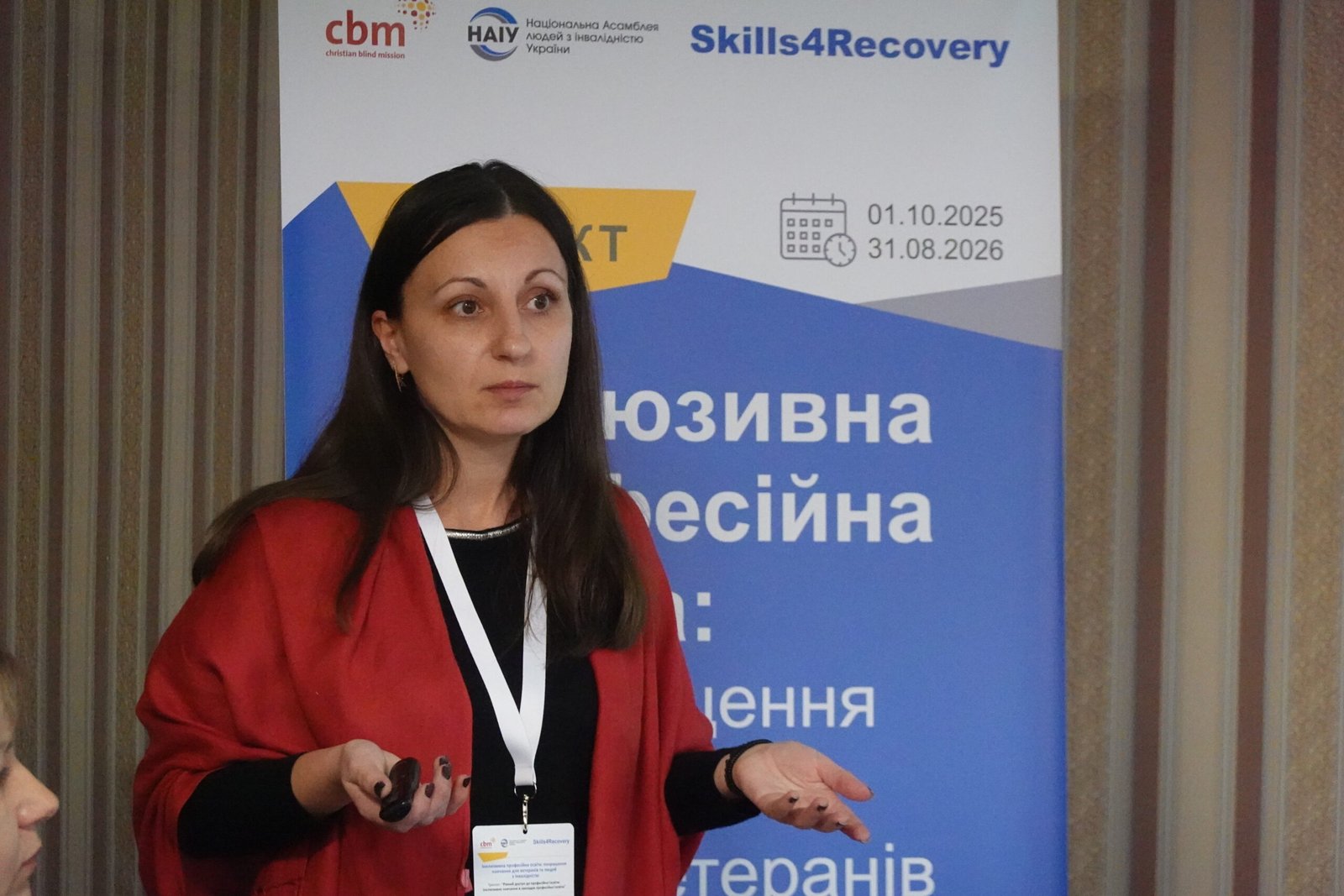 Далі слово взяла Джулія Шьонборн, проєктна менеджерка CBM в Україні. Вона наголосила, що CBM багато років працює над інклюзією людей з інвалідністю у різних країнах світу, і для України цей тренінг особливо важливий зараз — коли ветерани повертаються до цивільного життя та шукають нові професійні можливості.