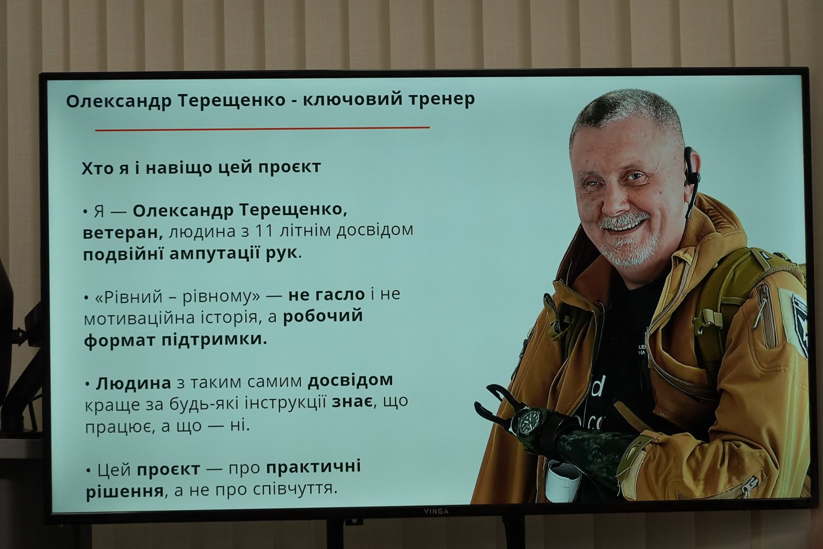 В межах проєкту команда Олександра Терещенка – він, а також його однодумці Олександр Шевцов, Євген Тюрін і Юрій Кравчук – працювала з ветеранами з ампутаціями і з тими, хто буде формувати в подальшому або вже формує систему реабілітації в Україні. Це спеціалісти-практики, ерготерапевти, фізіотерапевти тощо.