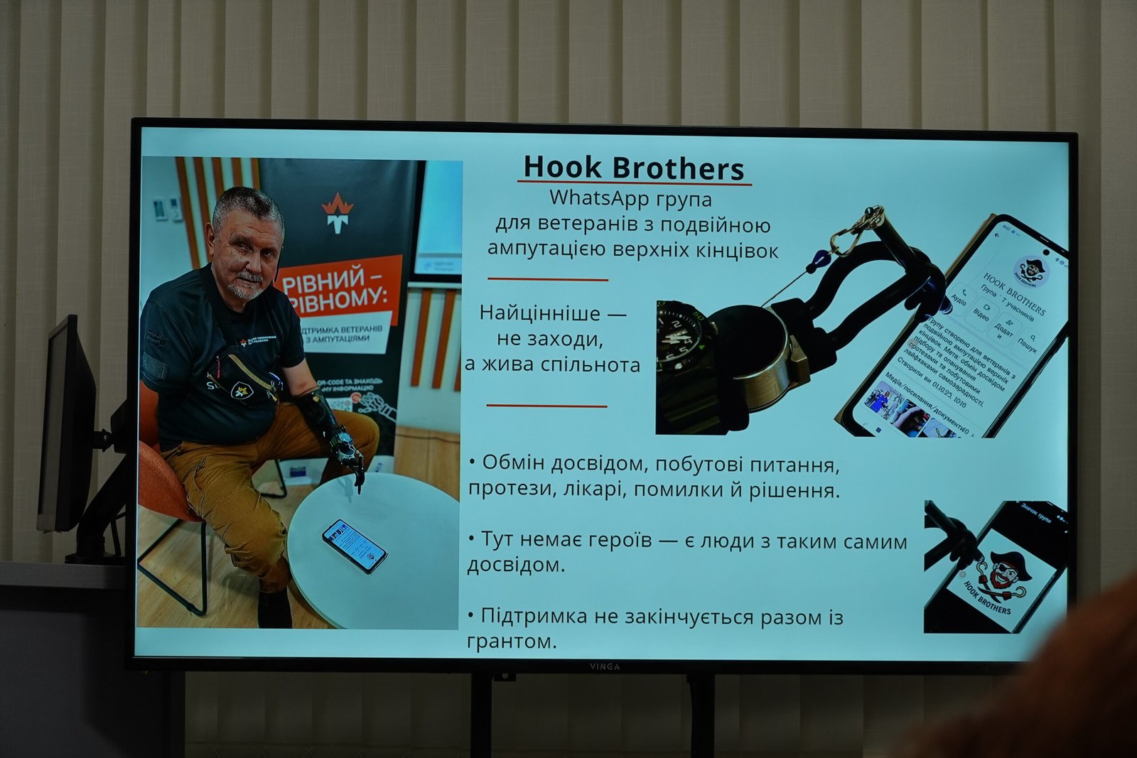 «Також ми створили WhatsApp-групу для людей з подвійною ампутацією, ми назвали її Hook Brothers і долучаємо всіх, хто має подвійну ампутацію. Це закрита група, зараз вона невелика, налічує 20 ветеранів, але кількість учасників постійно зростає», – розповів Терещенко.