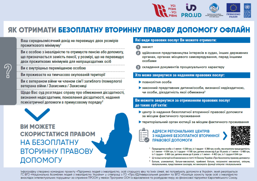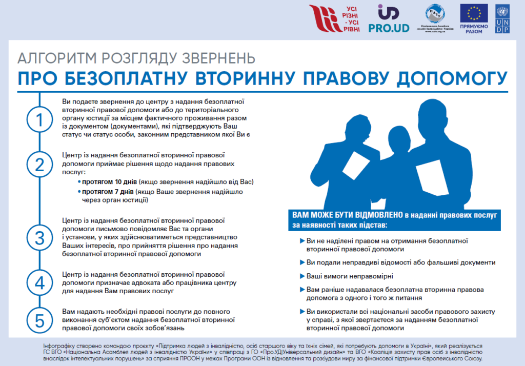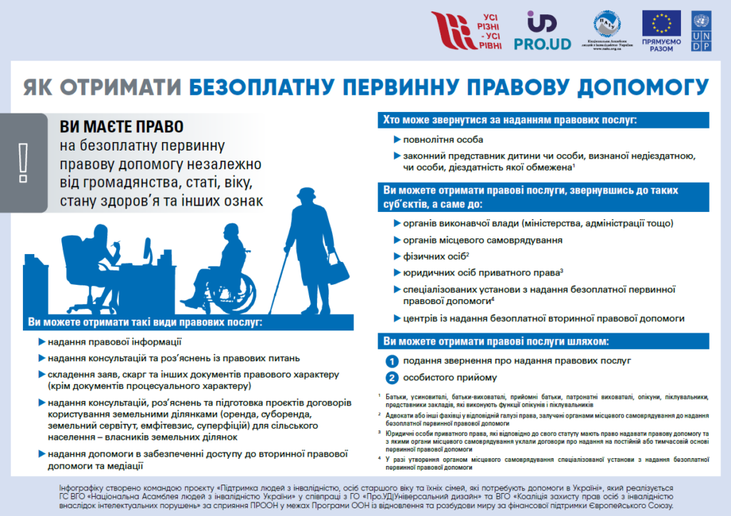 У контексті зазначеного важливо зауважити, що люди (діти) з інвалідністю та їхні законні представники наділені правом на первинну та вторинну праву допомогу, в рамках якої їм можуть надати правову допомогу та проконсультувати з правових питань, здійснити представництво їхніх інтересів у суді чи інших органах влади, скласти процесуальні документи та надати низку інших послуг.